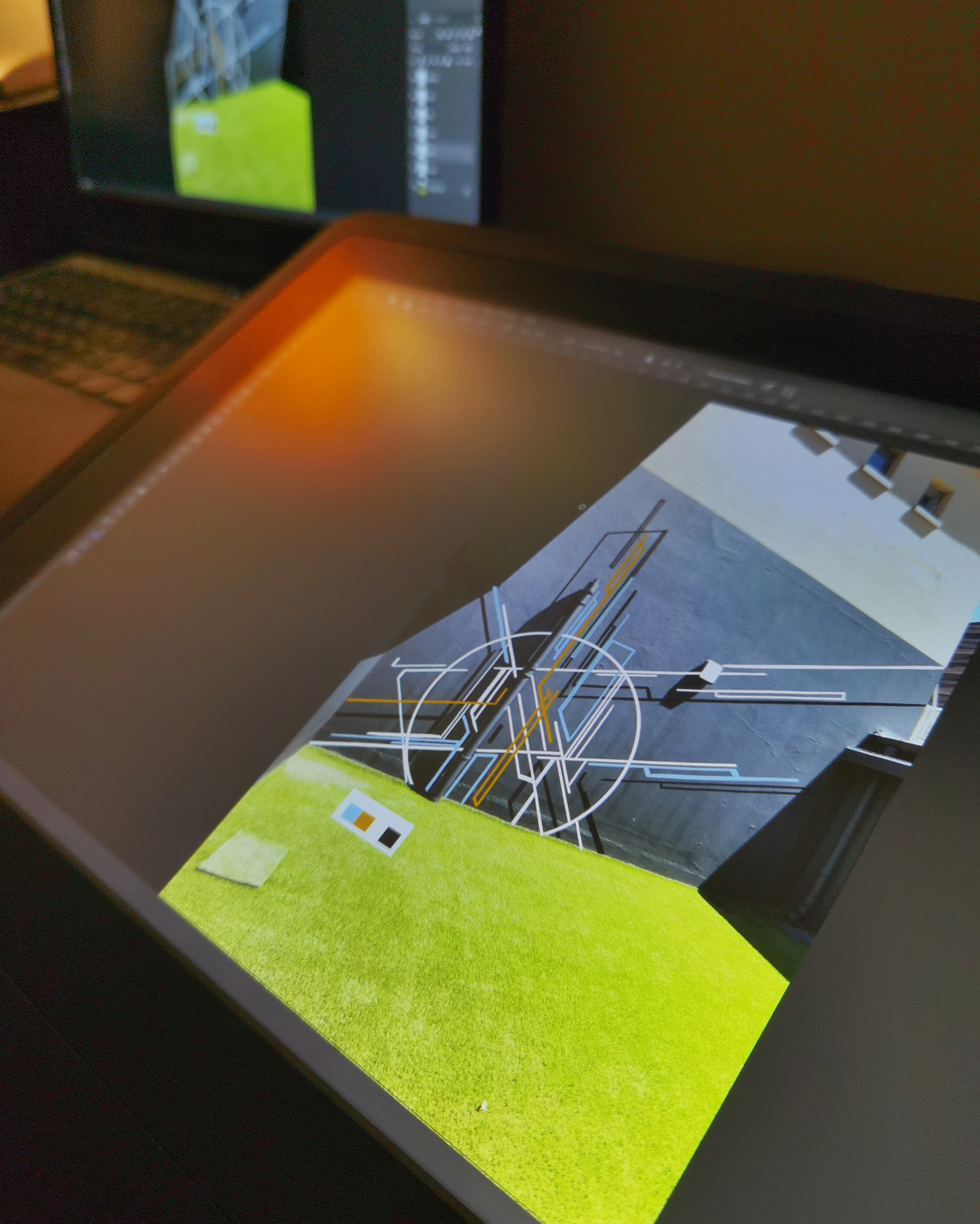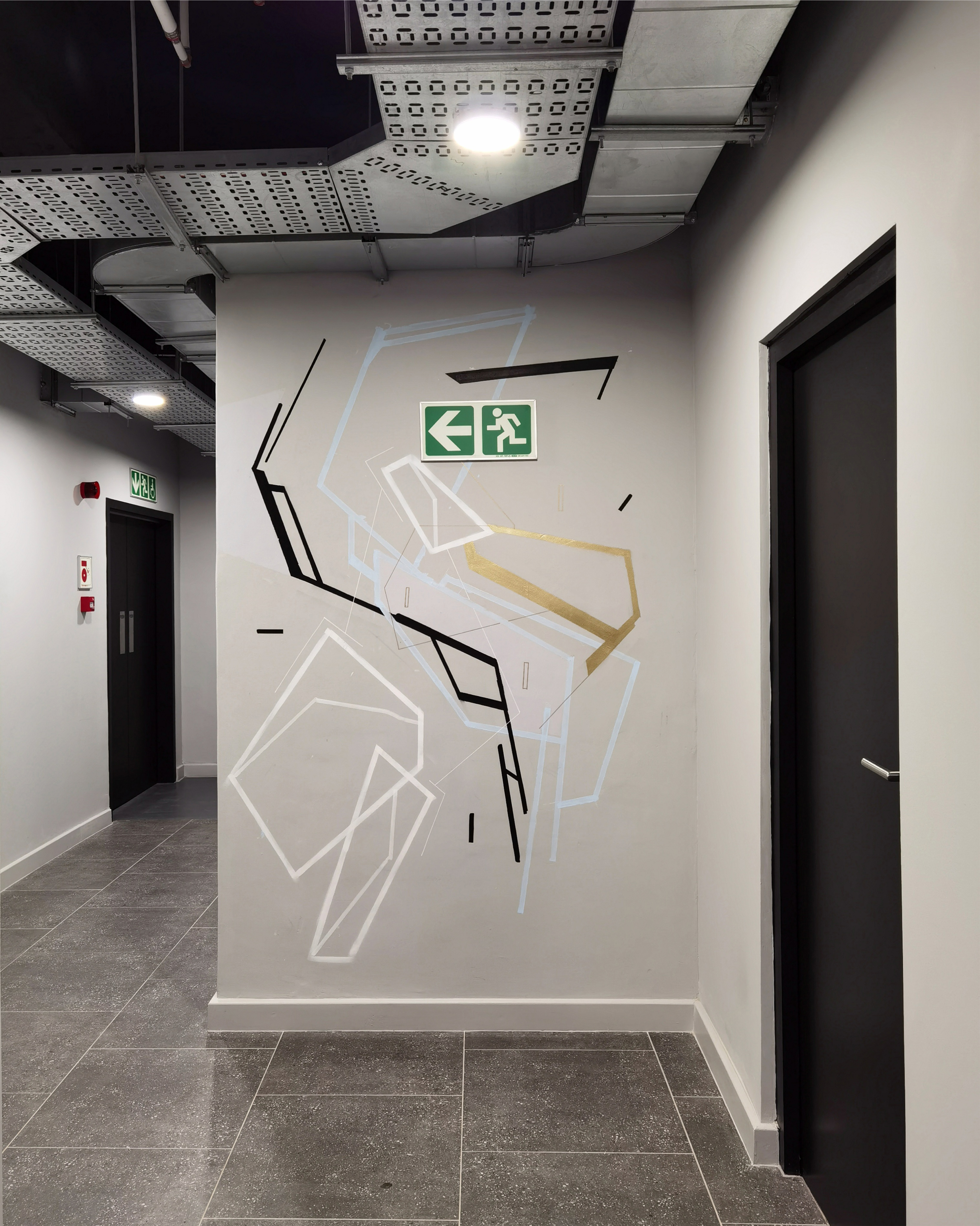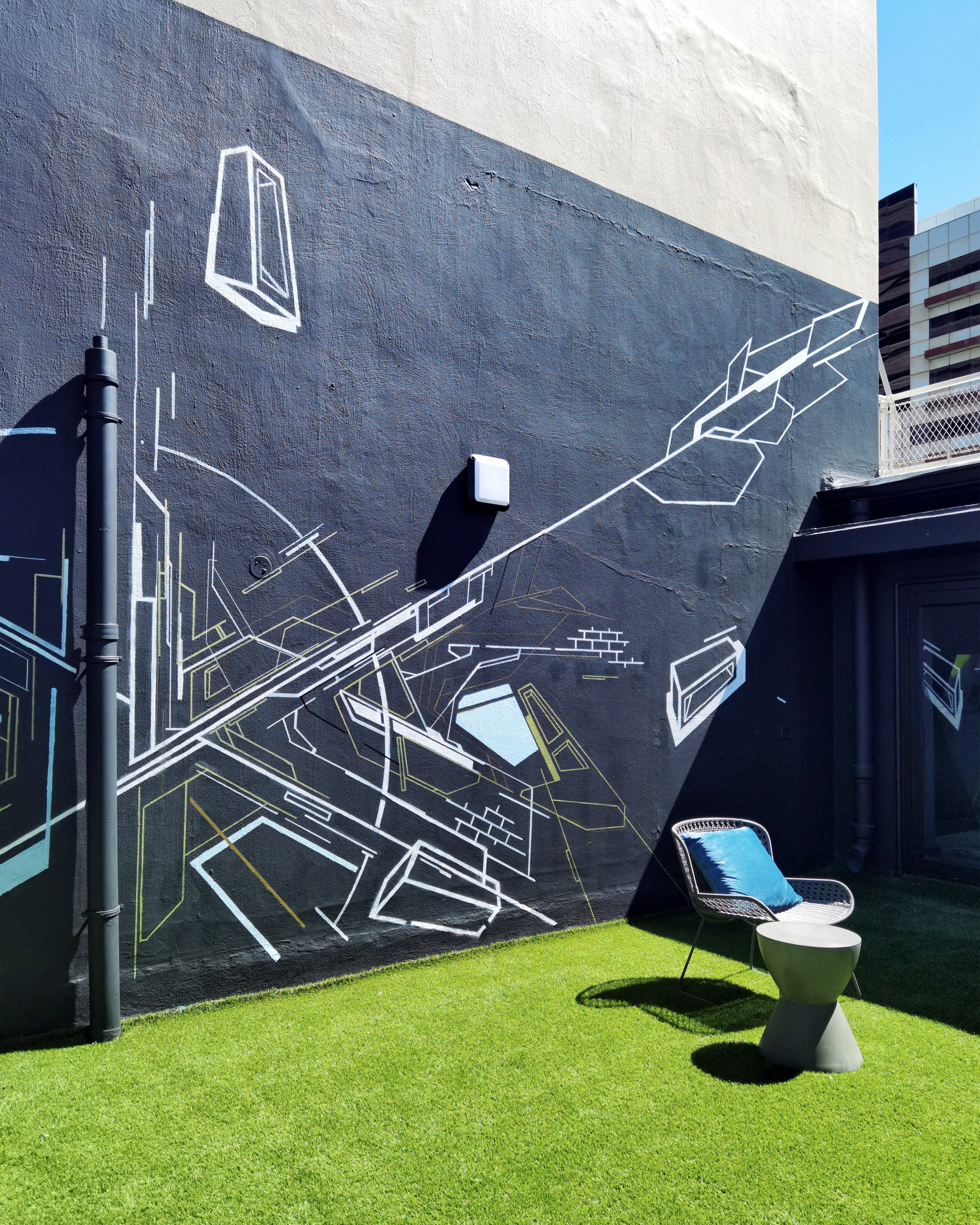 27Pc. Mural Package and 26Pc. Original Artwork Installation completed for BlackBrick (CPT) and Ryan Joffe Properties (Developer) over the course of 8 Days. The murals run the entire length of the building and form part of a collaborative project with a fellow artist (selected from BlackBrick's Art Competition) whose work will fill the alternating floors over the length of the building. Conceptually, the murals draw inspiration from Cape Town's sky and ocean (blue lines/geometries), the existing building elements (gold lines/geometries), the three cities where BlackBrick's Aparthotels are found (black lines/geometries), and the potential each BlackBrick has in linking you to the world (white lines/geometries) - as they see it, "Your Passport to the World".